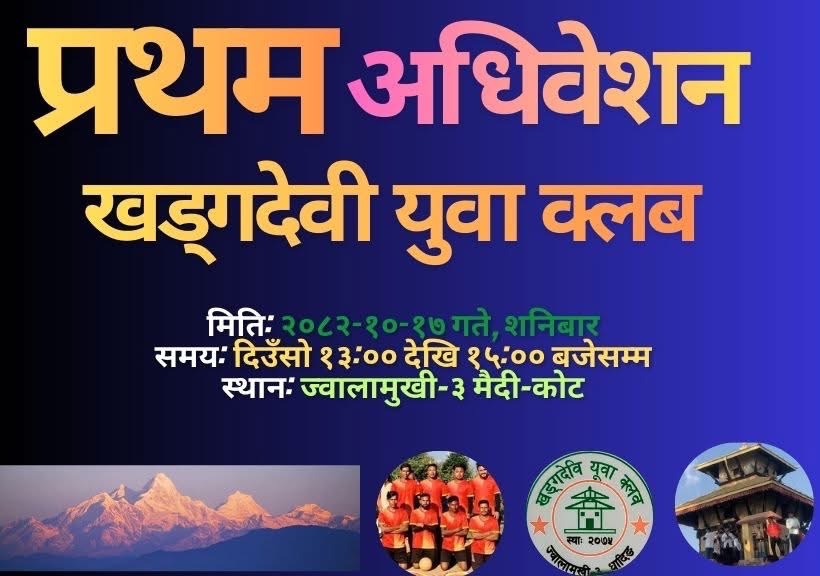 खड्गदेवी युवा क्लबको साधारण सभा तथा अधिवेशन १७ गते शनिबार हुने भएको छ । ज्वालामुखी गाउँपालिका वडा नं ३ स्थित मैदीकोटमा यहि १७ गते शनिबार साधारण सभा तथा अधिवेशन हुनेभएको हो ।